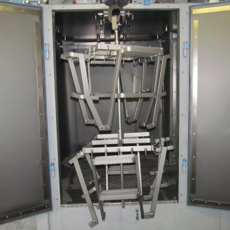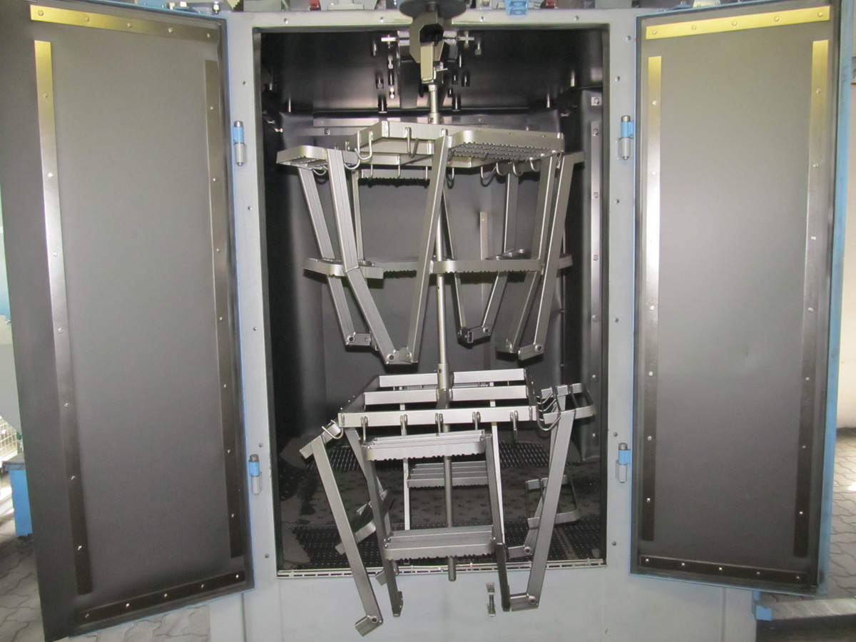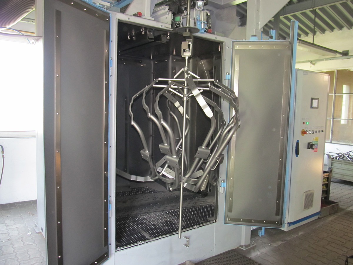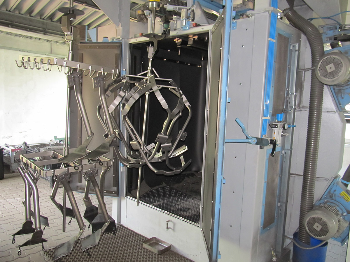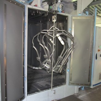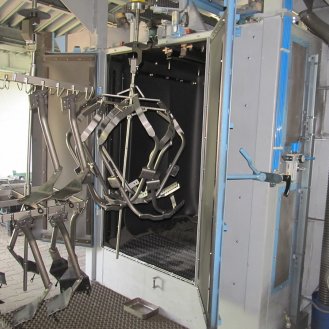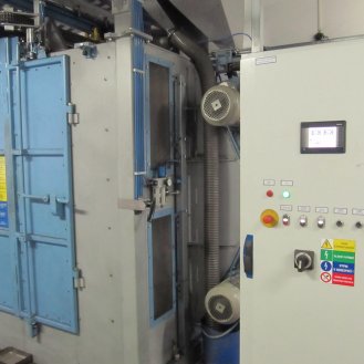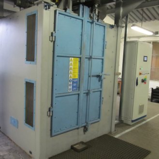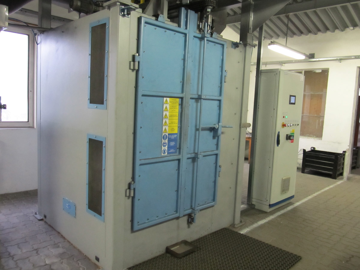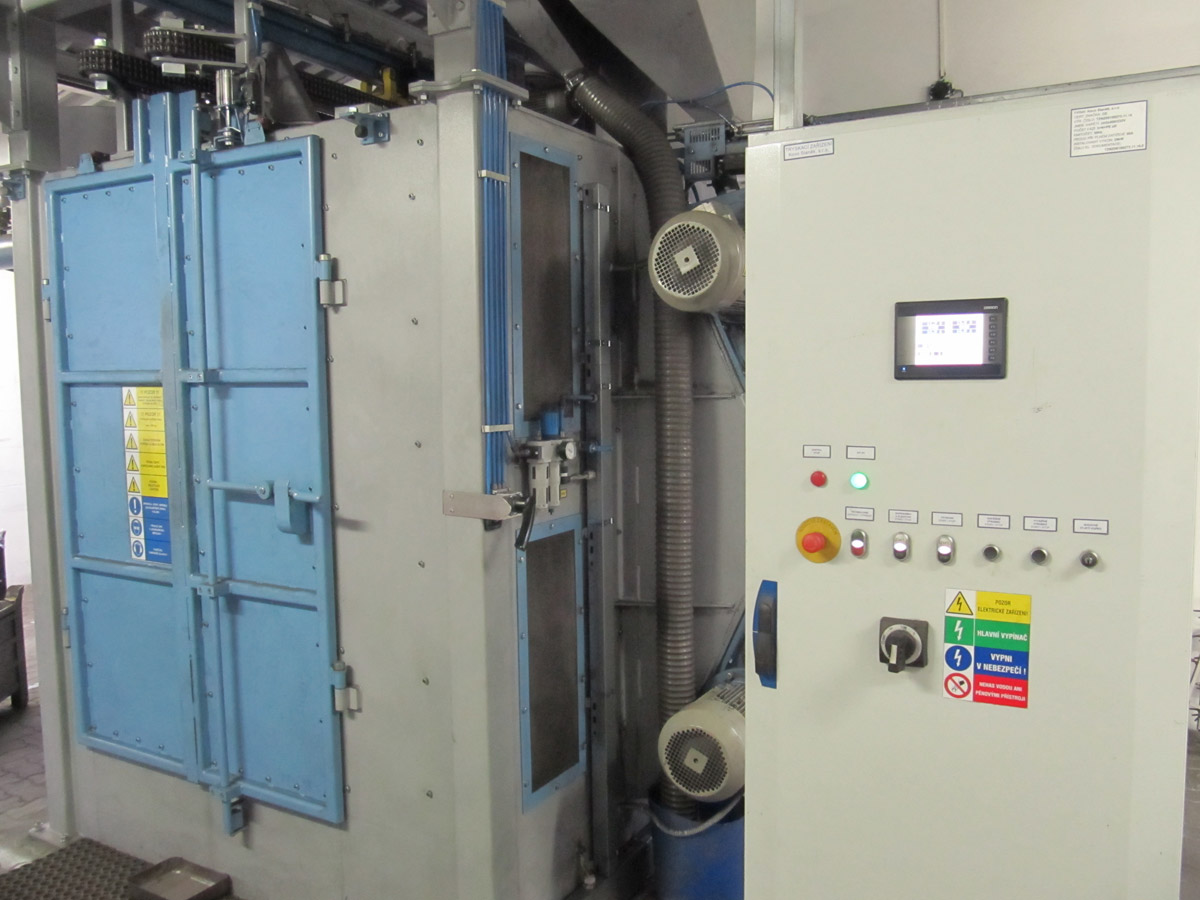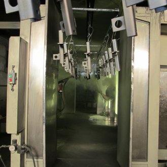 Zařízení je konstruováno pro tryskání ocelových, litinových nebo nerezových odlitků, výkovků, tepelně zpracovaných ocelových dílů, svařenců, k odstraňování rzi, k odjehlování nebo zpevňování povrchu. Max.: průměr otáčení závěsu 1110mm, max. výška závěsu 1600mm, nosnost háku 500kg.